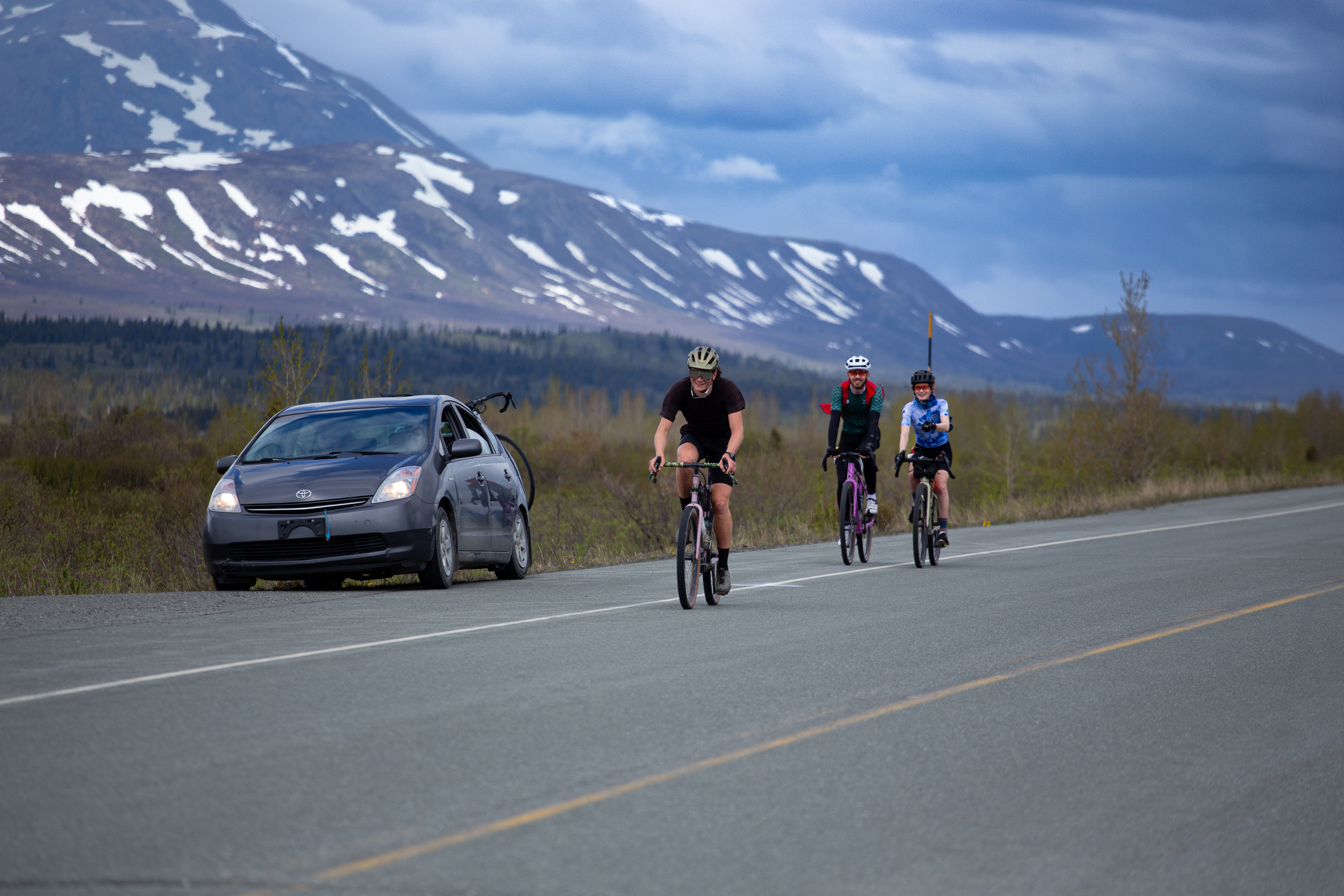 The next section of the ride stretches 106 miles (171 km) from Haines Junction to Whitehorse on the ALCAN. Expect more traffic on the ALCAN. Riders are encouraged to wear high vis and have front and rear lights. Whitehorse has full services including a bike shop.